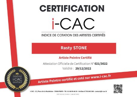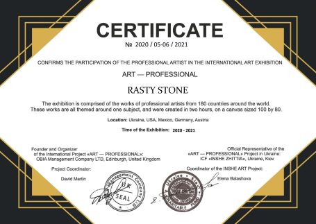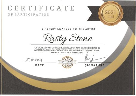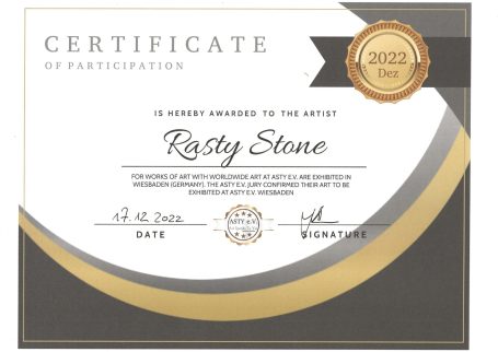 Die Kombination aus kreativem Ausdruck und professionellen Anerkennungen macht Rasty Stone zu einem einzigartigen Vertreter der zeitgenössischen abstrakten Kunst. Seine Werke sind nicht nur in Galerien auf der ganzen Welt zu bewundern, sondern haben auch wertvolle Zertifikate erhalten, die die Authentizität und die Innovationskraft seiner Kunst unterstreichen. Durch diese Auszeichnungen und Zertifikate wird sein unermüdlicher Einsatz für die Kunst sichtbar und inspirierend für kommende Generationen von Künstlern.