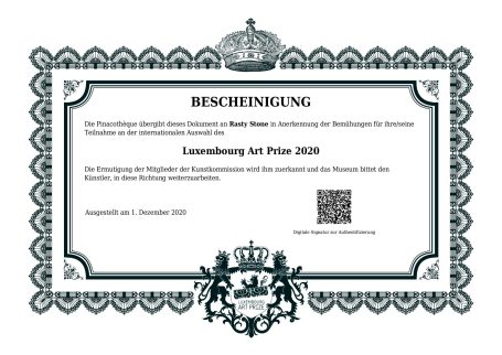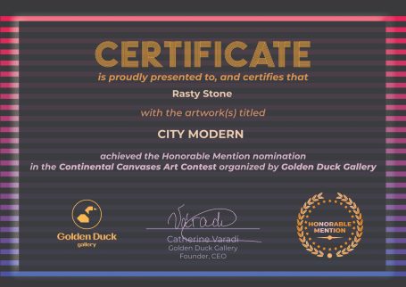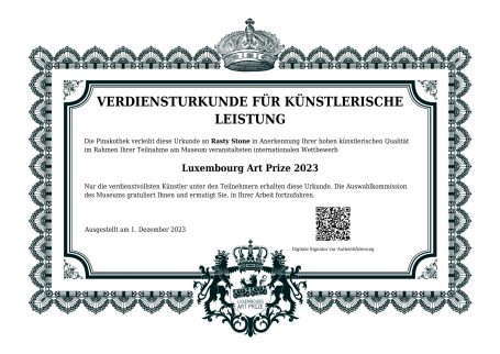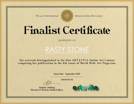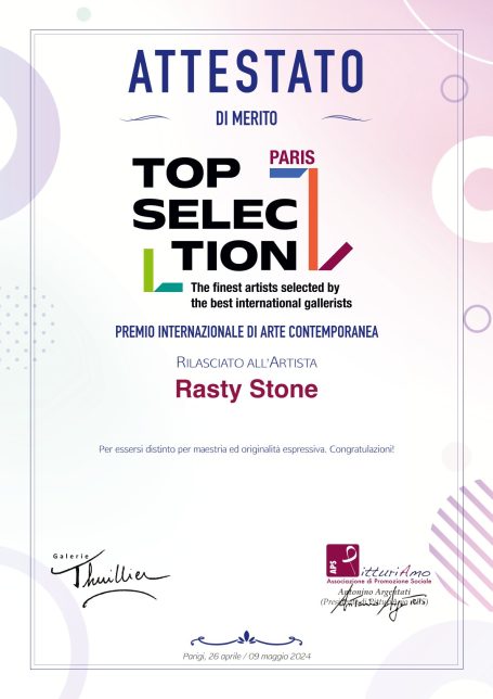 Mit jeder Auszeichnung wird jedes Werk von Rasty Stone sowohl als Kunstwerk als auch als Anlageobjekt wertvoller. Die Anerkennung durch internationale Kuratorenkomitees, Kunstkritiker und führende Galerien bestätigt die außergewöhnliche Qualität und den hohen Wert der Werke des Künstlers.