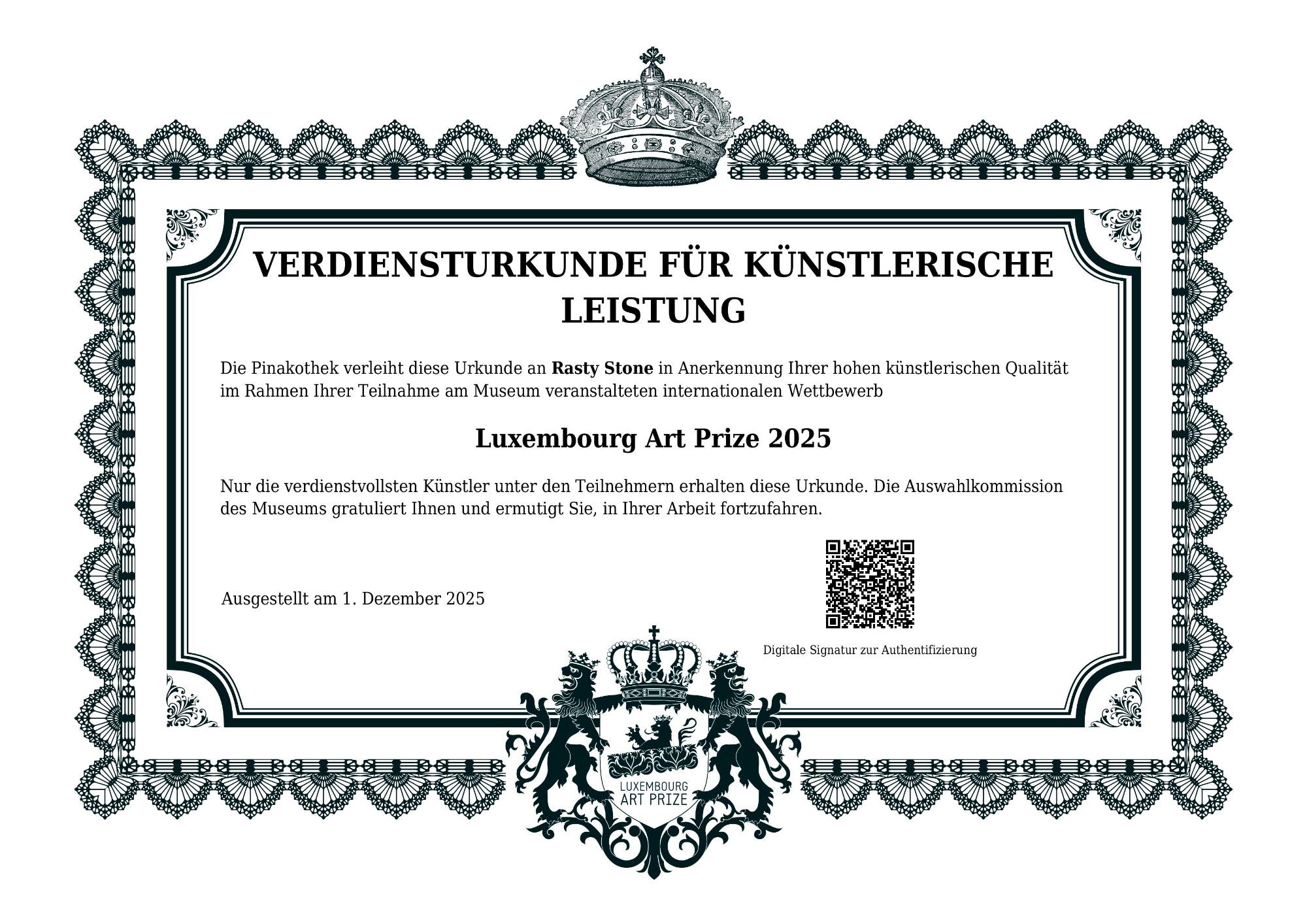 Mit jeder Auszeichnung wird jedes Werk von Rasty Stone sowohl als Kunstwerk als auch als Anlageobjekt wertvoller. Die Anerkennung durch internationale Kuratorenkomitees, Kunstkritiker und führende Galerien bestätigt die außergewöhnliche Qualität und den hohen Wert der Werke des Künstlers.
